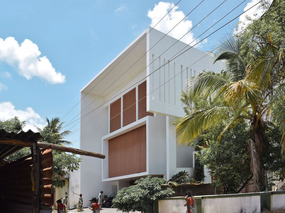 Planning of the building is done in such a way where multiple folds are created on the southern façade to encourage wind flow through gaps between them. The front Façade facing west is articulated to create a gesture like Indian havelis. Graticule windows, projecting lattice boxes and large over hangs reduce surface temperature and regulates wind flow. Significance of this lattice façade is to manifest a dichotomy of motion of privacy and participation simultaneously.