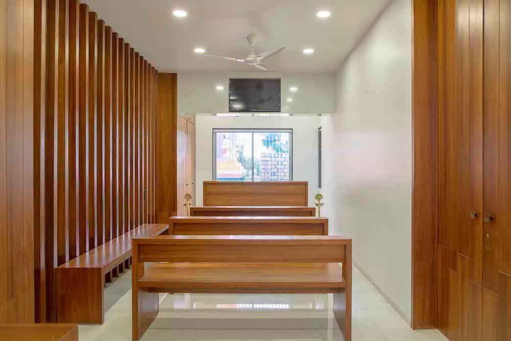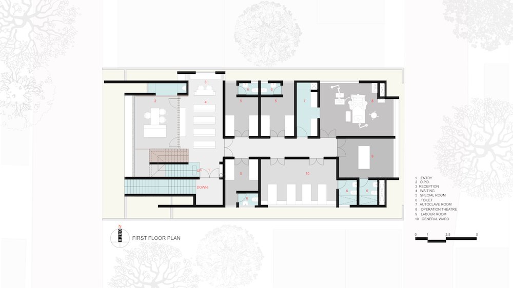 The abiogenic escalier adjacent to the column below three-storied high canopy further continuous to the first floor. At the landing of steps, the doorway opens into a waiting space. The waiting area is oriented such, that frames the adjacent temple shrine. It divides the hospital floor space into a consultancy and viable areas.