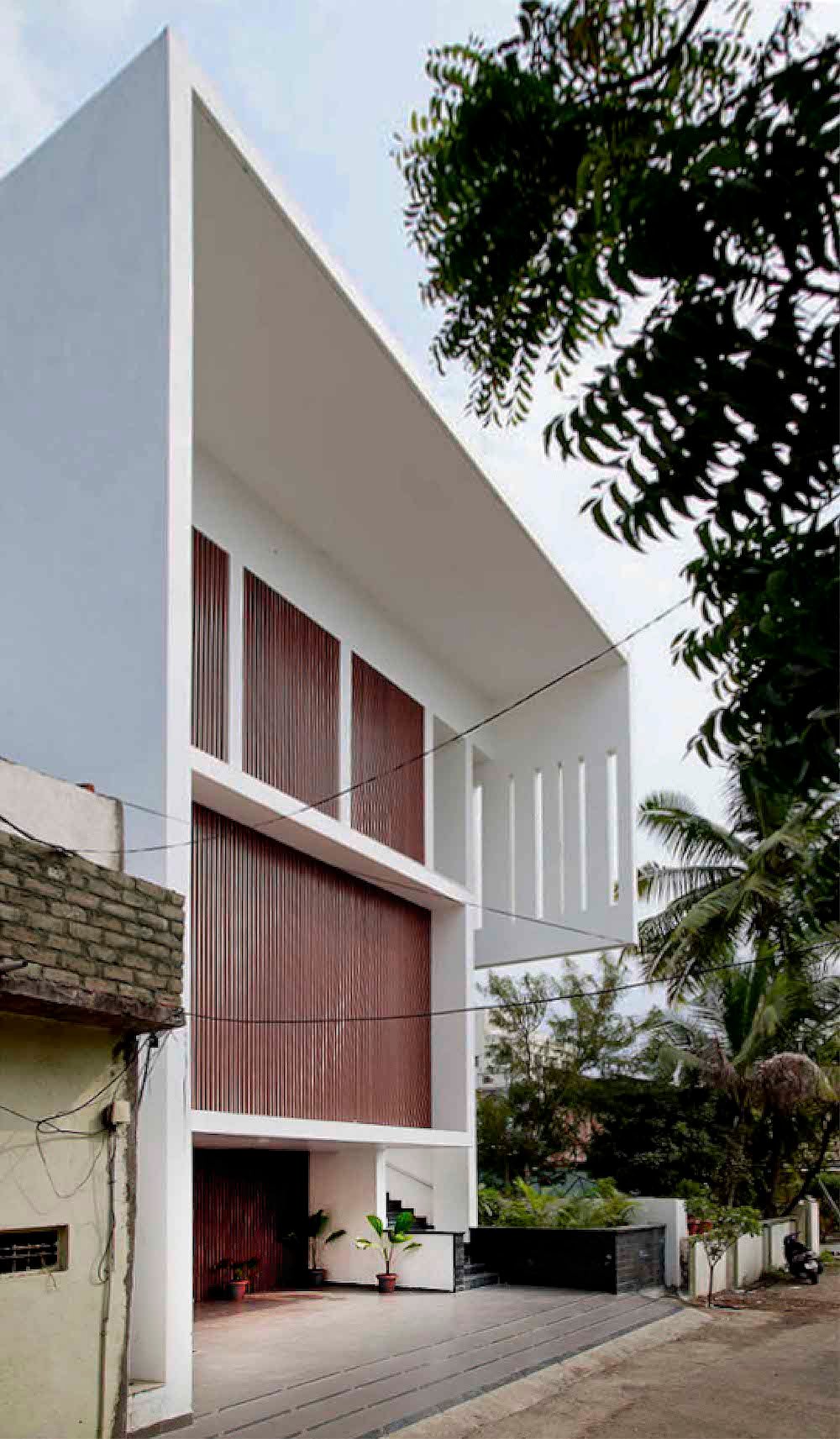 Planning of the building is done in such a way where multiple folds are created on the southern façade to encourage wind flow through gaps between them. The front Façade facing west is articulated to create a gesture like Indian havelis. Graticule windows, projecting lattice boxes and large over hangs reduce surface temperature and regulates wind flow. Significance of this lattice façade is to manifest a dichotomy of motion of privacy and participation simultaneously.